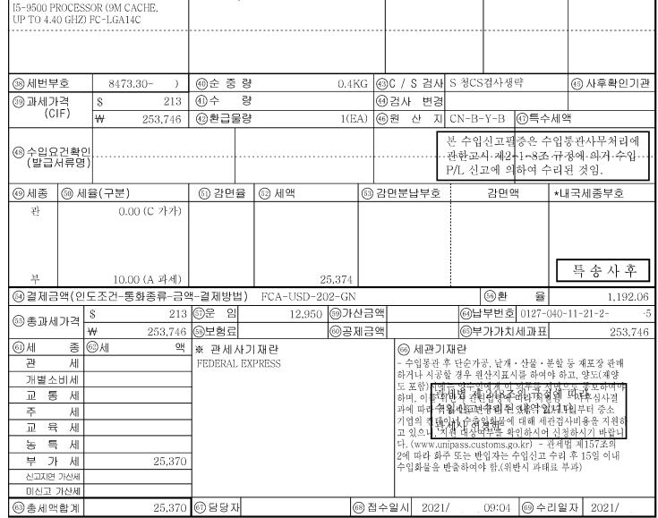 CPU의 경우 수리가 아니라 교환이기 때문에 새로 들어오는 CPU에 관세가 붙습니다 보통 씨피유의 가격이 저렴하지 않기 때문에 10%의 부가세만 붙어도 2~3만원은 훌쩍 넘습니다