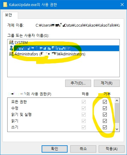 아래와 같이 SYSTEM을 제외한 모든 사용자 그룹의 권한에 거부를 선택해줍니다